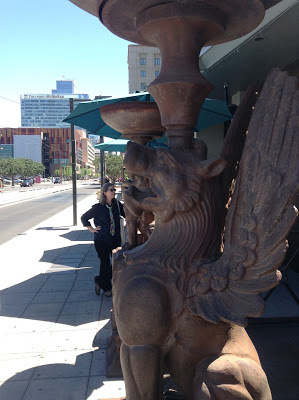 We got out with the nerds and cosplayers, and were greeted by giant metal insects, pedicabs, concrete barricades, police cars with lights flashing, dogs sniffing the perimeter for . . . explosives? . . . drugs? Then we got scanned with the metal detectors at the security checkpoint.