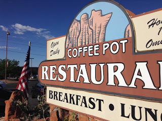 Made it to the Coffee Pot in Sedona at 8 Am. Had a buckwheat pancake fix among the fabulous faux cowboy and Indian décor.