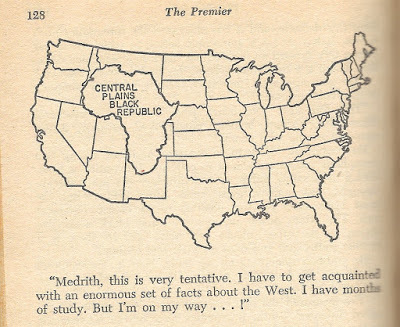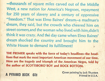 I found it at the Brass Armadillo Antique Mall, among some vintage science fiction. The ancient paperback had a black man who looks like a disheveled, pissed-off Sidney Poitier raising a clenched fist on its cover. There was also a headline: AN EXPLOSIVE NOVEL ABOUT A NEGRO WHO SHOCKED AMERICA. On the back cover: “the black republic --thousands of square miles carved out of the Middle West, a new nation for America’s Negroes . . . And the day came when Elmo Baines’ dream shocked the country and brought him to the White House to demand its fulfillment.”
