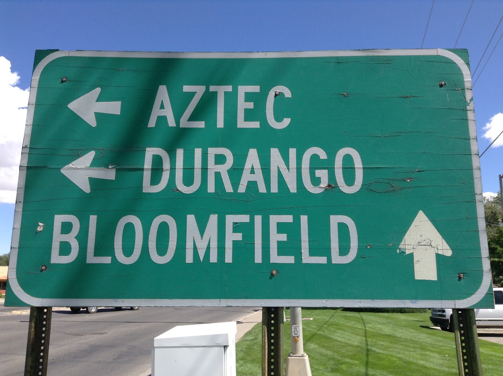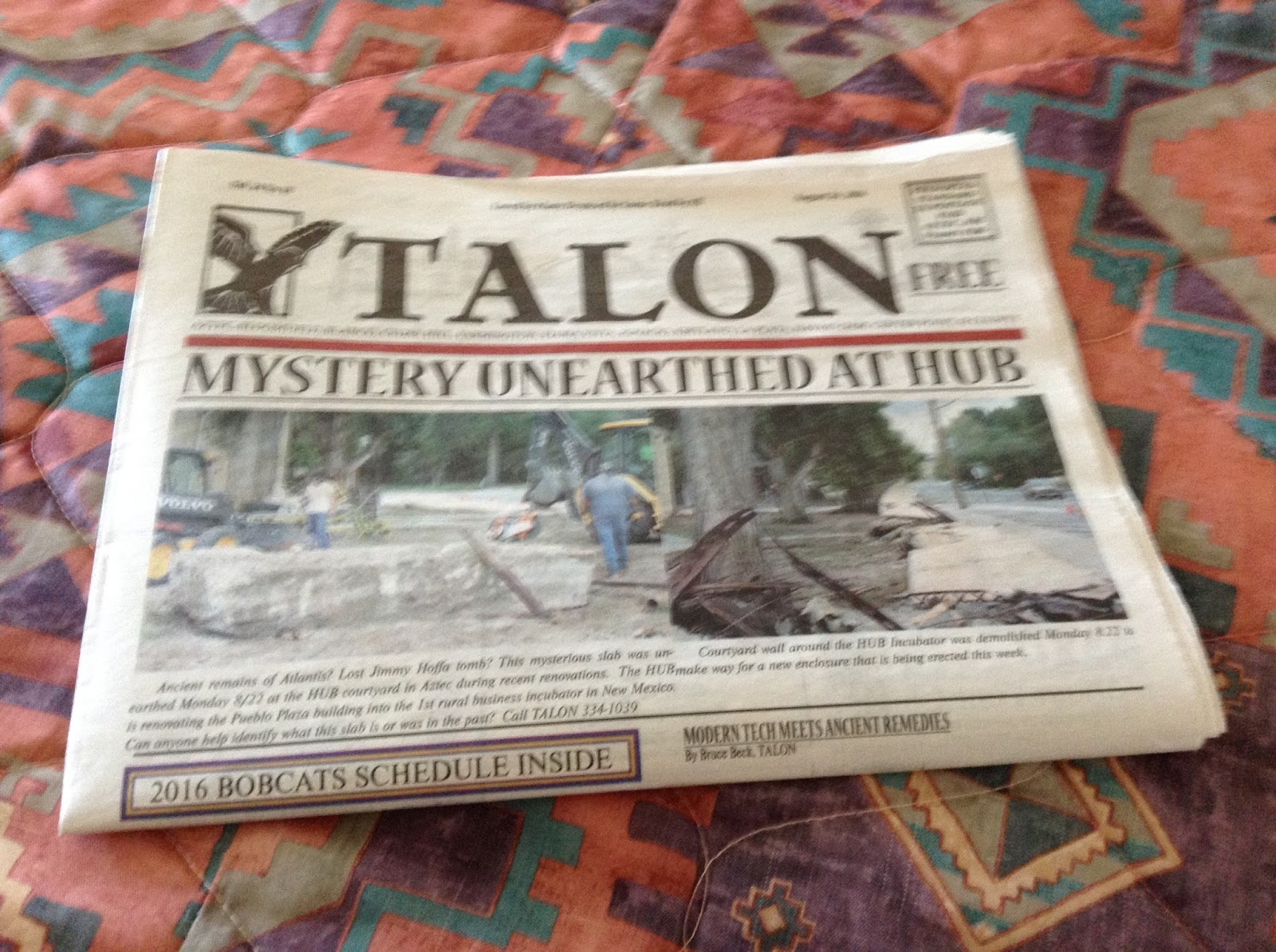 We stayed at the Region Inn, where I picked up a copy of Talon,”Loved my Many, Despised by Some, Read by All,” a free newspaper covering Aztec, Bloomfield, Blanco, Cedar Hill, Farmington, Flora Vista, Ignacio, Kirtland, La Plata, Navajo Dam, Center Point, and SJ County. It had an interesting headline: MYSTERY UNEARTHED AT HUB Ancient remains of Atlantis? Lost Jimmy Hoffa tomb? This mysterious slab was unearthed Monday 8/22 at the HUB courtyard in Aztec during recent renovations. They asked their readers if they could help identify the . . . thing.