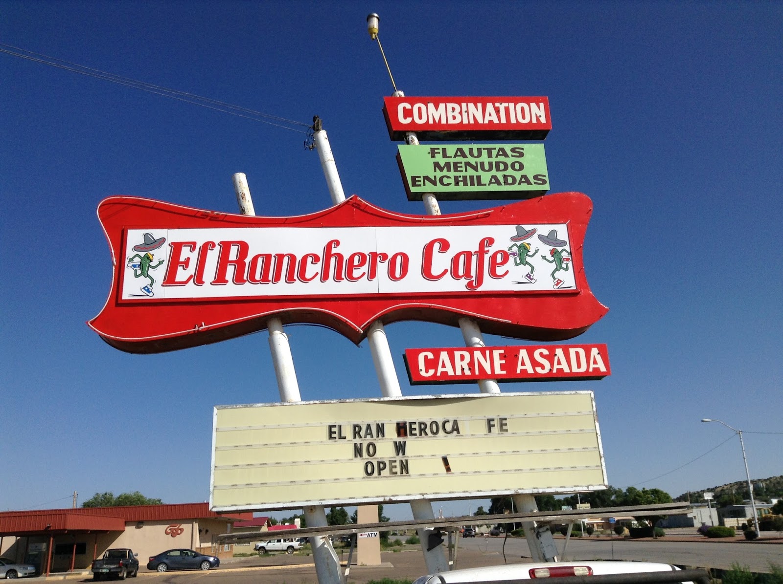 We passed the El Morro Ranches Subdivision, and a USE EXTREMECAUTION sign on the way to Grants, “The City of the Spirit,” where we checked into the Super 8, and had another dinner at El Cafecito. The spices on the tacos were subtle at first letting you taste the meat, then they got the inner ears tingling, and the nose running, and made a proper mess.
