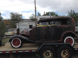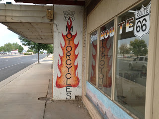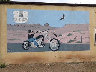 After cruising the magnificent desolation of the lava-fields of El Malpais, Em and I explored Grants' Main Street/Santa Fe Avenue/Route 66, with its murals, quaint motorcycle shops, bars, eateries, motels, and strange vehicles. Some are still in business, others dead and abandoned, and often it's hard to tell which is which. Not a ghost town. Maybe a zombie town, but if you say so, it comes to life and objects.