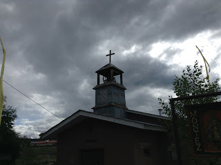 It usually rains as we approach Truchas. This time there was a gigantic, grey cloud, like a tidal wave crashing down in slow motion, rotating in an attempt to become a tornado. Things cut loose as we reached the mountain roads. Pounding rain. Lightning. Thunder. Muddy water running in the washes.