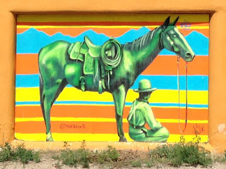 And a new world springing up in the form of murals, like this one with a green horse in Taos.