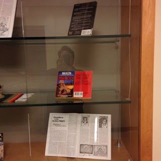 There it is, behind the reflection of Josh Rios, a copy of High Aztech . And there's the back cover of Smoking Mirror Blues , and a couple of my articles, that I also illustrated, from Different Worlds . All on display, behind glass. What is this? Rios and Anthony Romero are putting together a display they call Is Our Future a Thing of the Past?, Part 3 . It's all about Chicanafuturism. What's that? Maybe I should just give you the official version: