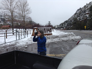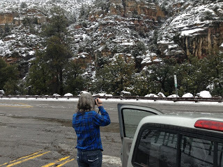 Cruised up Oak Creek canyon, through rain, into the snow until we started slipping in the snow . . .