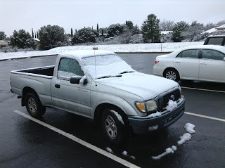 It snowed overnight! El Troque was covered with snow, including the truck bed, and it just kept coming down!