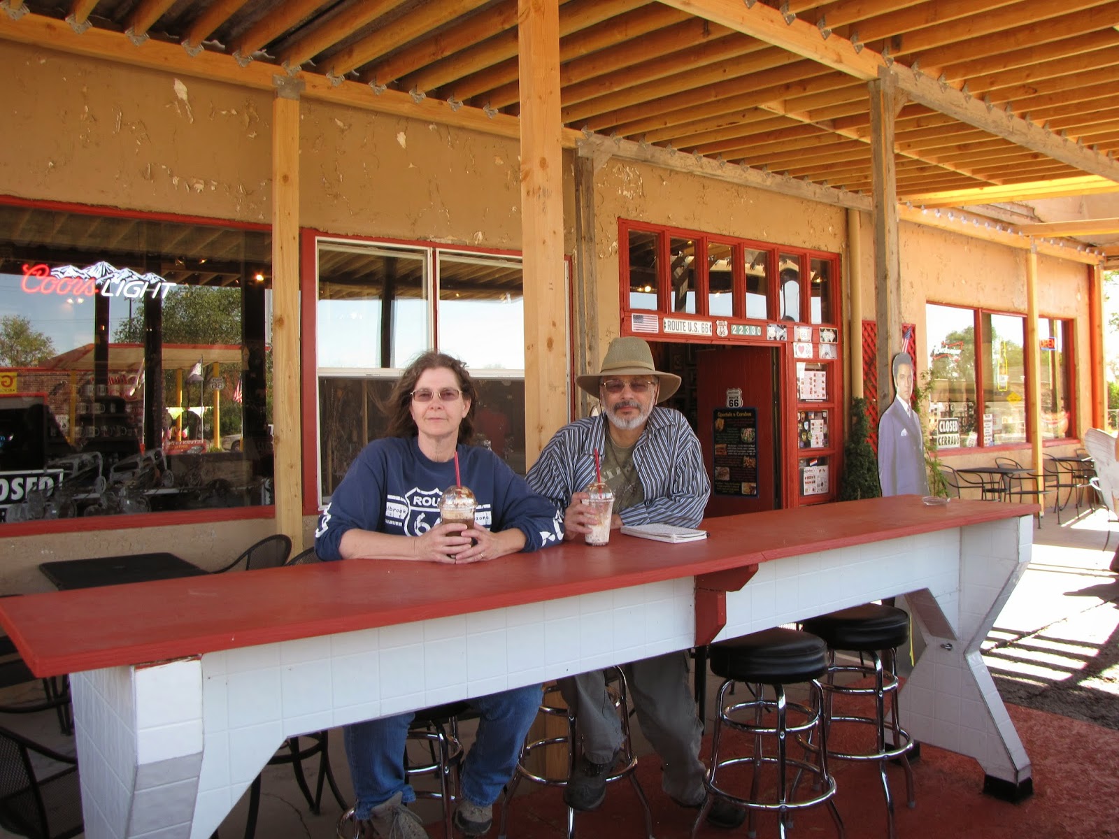 We stopped at Route 66 Roadrunner for fancy-schmancy coffees (the kind I only drink on the road). A local oldies station played David Bowie's Young Americans while cutouts of John Wayne and Marylin Monroe looked on. I kept saying “Excuse me, sir,” to a an Elvis cutout.