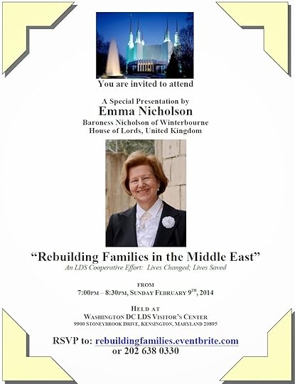 An inter-faith, non-fundraising presentation by Emma Nicholson, Baroness Nicholson of Winterbourne, Member of the House of Lords in the British Parliament, will be held Sunday, February 9th 2014, at the Washington D.C. Visitor's Center near the Kensington, Maryland Temple of The Church of Jesus Christ of Latter-day Saints.