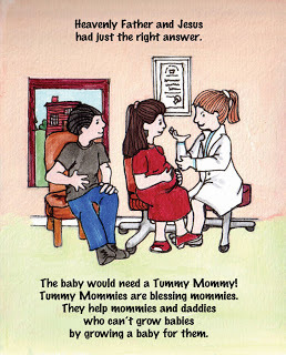 "Tummy Mommies . . . help mommies and daddies who can't grow babies by growing a baby for them." Adoptive parents should find this a comfortable vehicle to help their children recognize as adoption as part of a divine plan for families. Pause and really study the charming illustrations which are so packed with thought that entire discussions could be launched from each page.