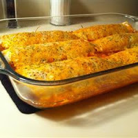 Now begin filling the tortillas with the chicken mix. Lay about a cup of mix along the center line, fold the flap over and roll them up like a cigar. Place them, seam side up, in the pan and repeat until you reach the other side. You may have to squish to fit them. Spread the remaining soup mixture over the top, taking care to coat all the edges. Top with shredded cheese. Cover with foil and either freeze or bake at 350 degrees until center is bubbly—about 40 minutes. (If the pan is so high that the foil touches the enchiladas the cheese will stick to the foil, so suspend the foil above with toothpicks inserted into the food.) Remove the foil during the last few minutes taking care not to let the cheese brown.