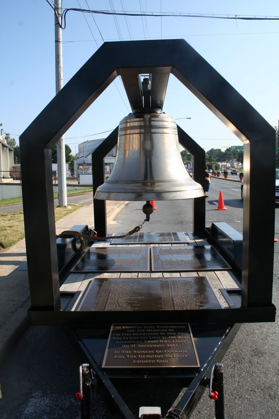 lives that day."Following speeches and the dedication of the monuments, a 3500 pound bell, one of the "Bells of Remembrance," inscribed with the names of the firefighters who lost their lives in the 9/11 attacks, was rung in commemoration.