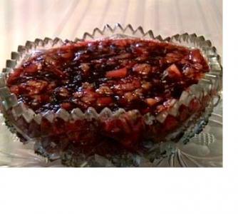 Dissolve Jello in hot water. Add cranberry sauce. Add pineapple. Then add walnuts. Pour 1/2 of mixture in mold and let set. Spread sour cream over this. Pour remaining Jello mixture over top. Chill for four hours.Copyright 2009 Laurie LC Lewis, (To obtain permission to copy or reprint any portion of this post, please contact the author at lclewis2007@gmail.com)