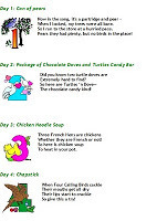 Day 1: Can of pearsDay 2: Package of Chocolate Doves and Turtles Candy BarDay 3: Chicken Noodle SoupDay 4: ChapstickDay 5: Can of Pineapple RingsDay 6: Graham Crackers, Chocolate Bars & Large MarshmallowsDay 7: Sparkling WaterDay 8: Milk DudsDay 9: Epsom Salt or Bath SaltsDay 10: Starburst Candy Day 11: Bubbles! Day 12: Christmas CD