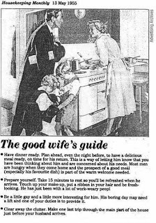 I came across this article some time ago. It's absolutely authentic, from Good Housekeeping magazine. The date--13 May 1955. It's a little hard to read, but give it a try, and consider how things have changed. It seems laughable compared to our day, but think Donna Reed or June Cleaver. Now you have the picture.