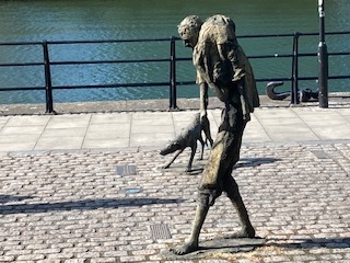 Whisked away on a 50-seat bus, our delightful and knowledgeable tour guide, Ann, enlightened us to the history of Dublin. Soon into the ride I saw statues honoring victims of the Great Famine. Dedicated in 1997, the Dublin Famine Memorial is a haunting reminder of the disaster that overtook the Irish people. The six large figures are scrawny and ragged as they stumble toward the ship that will take them to a new life in America.