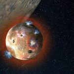 Loki is the largest of Io’s plume-spouting volcanoes. It’s a 125-mile-wide (200 kilometers) volcanic lake that erupts at regular intervals — approximately every 540 Earth days. These eruptions release 250-mile-tall (400 kilometers) jets that distribute sulfur and sulfur dioxide widely across vast areas of the surface.