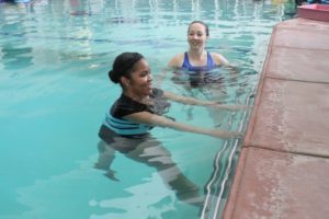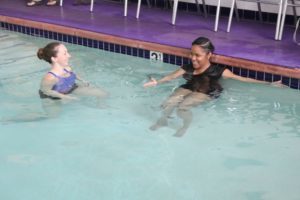 Bill did twenty pool sessions with us. A large, muscular athlete, Bill needed to wear two flotation belts in order to be upright in the pool without his chin touching the water. His therapist strapped a CompletePT belt on him, the most buoyant of the belts and also added a second belt to counteract the downward pull of his muscle density. He did deep-water running and powerwalking for aerobic fitness in our 7-feet deep pool. At 6’4″, he needed our newly-remodeled pool — he would have been dragging his feet on the bottom of the old one that was only 6′ deep. Then he stretched, using our double bar system that protected him from violating his total hip surgery precautions regarding movement. Next he did some kicking exercises to strengthen core and leg muscles. In shallow water, a flotation cuff was put around his ankle to help increase the range of motion of that post-surgical hip as he did standing leg exercises. Our licensed physical therapists will determine when it is time to switch to adding resistance pieces around the ankles to increase strength.