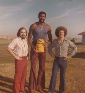 Left to right: Lynda Huey, Wilt Chamberlain, Patty Van Wolvelaere