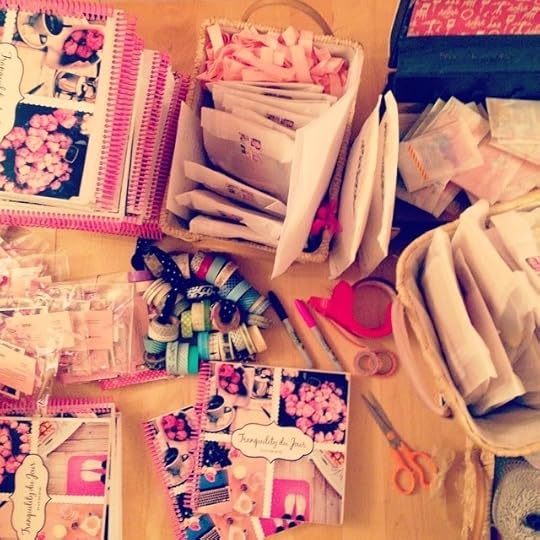 This morning we turned the Pink Palace into a studio to record the new Daybook video. The above picture shows the shoot set, while the bottom one shows the confetti-infused packet {stuffed with info on our online playshop} set up. Clearly, our tiny dining table is most versatile.