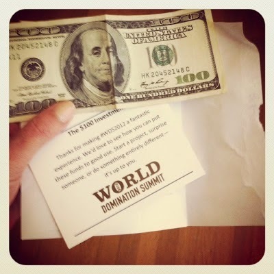 This feeling began after hearing Scott's amazing story and thinking of my own big dreams for activist efforts. Sadly, the feeling continued through the entire summit. The summit ended with the summit founder, Chris Guillebeau, giving us each a $100 bill as we exited and challenging us to "start a project, surprise someone, or do something entirely different." Perfectly aligned with his awesome book, $100 Startup.