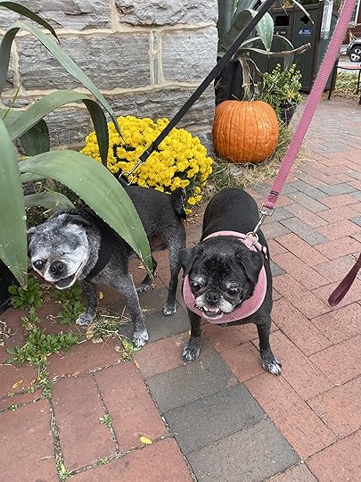 Walking in the woods with Mookie on a leash and Gizmo in a sling (see above photo)