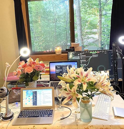 Sunday Tim, Mookie, and I started the day at the farmers’ market picking up a few essentials—peaches, heirloom tomatoes, Bibb lettuce, lilies. After a drive through the West Virginia mountains, we spent the rest of the day prepping for the 500th Podcast Soirée—Tim immersed in the tech set up (three computers, two mics, one phone) and me tying a bow around the programming.
