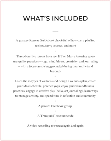 Next Saturday, May 2, I’ll be hosting one more virtual retreat focused on using our go-to practices—yoga, mindfulness, creativity, and journaling—to experience more tranquility during quarantine.