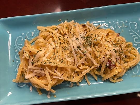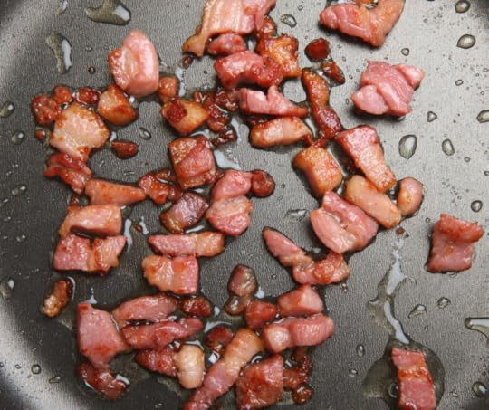 This is my version of pasta carbonara, it alters slightly from the basic recipe, but I guarantee you, it is heartily delicious.