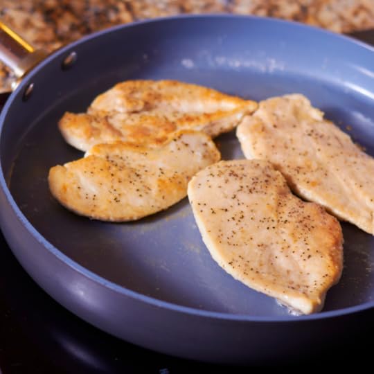 season chicken breasts with salt and pepper, and brown them on both sidesremove from heat and cut into bite sized pieces