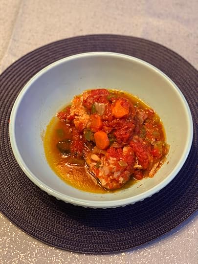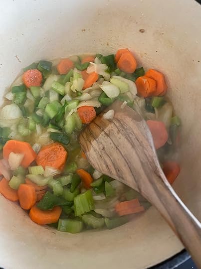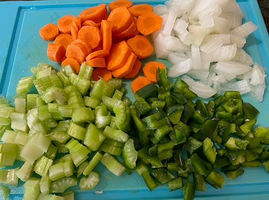 Slice, dice, and chop, carrots, celery, onion, pepper, set aside.