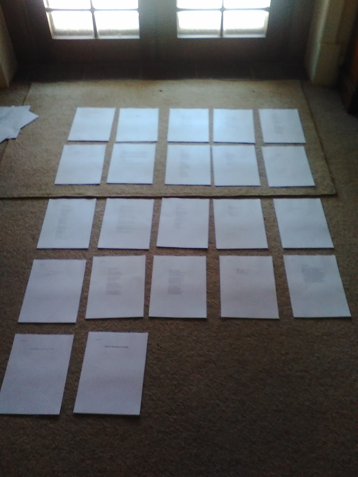 Speaking of the manuscript. It's the first time I have laid it out on the floor and originally I was skeptical about the usefulness of such a process ( I initially arranged it in a Pressbooks file) but I must say, as a result of the process, I did switch the location of 3 poems. So, not without its merits.