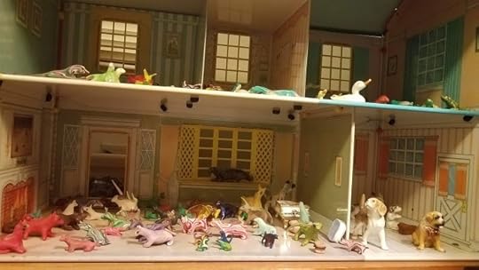 I now have a second dollhouse, also tin but this one from the 1950s, next to the first. I unpacked all the little animals I made when I was a kid from Fimo (and a couple from clay) and which have been in boxes for ten years, and gave them a home: