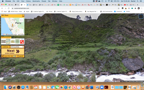 I'm hiking in Peru, beside a rushing stream. It looks a bit chilly, but I brought a warm coat and a thermos of hot cider.