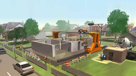 Contour Crafting is a form of 3D printing that uses robotic arms and nozzles to squeeze out layers of concrete or other materials, moving back and forth over a set path in order to fabricate large objects such as houses. It is a construction technology that has great potential for low-cost, customized buildings that are quicker to make, reducing energy and emissions along the way.