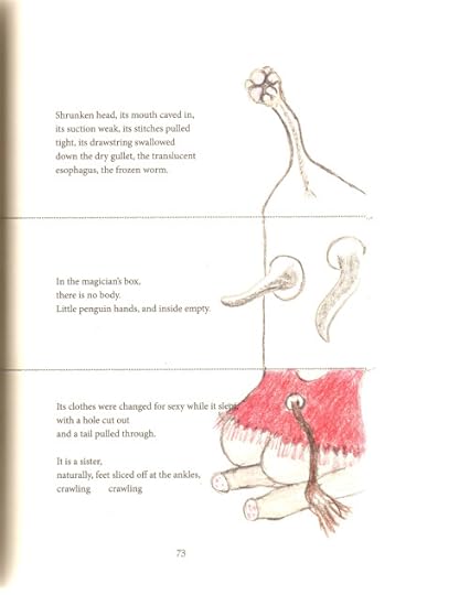 I haven’t been on Tumblr for awhile but that hasn’t meant I’ve stopped drawing! Recently, a poet friend of mine, K.I. Press, launched her latest poetry book called Exquisite MONSTERS. This book is meant to be interactive, and can be used for drawing. In the latter half of the book in a section called “Exquisite Monster (in interchangeable parts)”, the pages are divided into three portions with text roughly corresponding to the head, torso, and legs parts of the body. You can draw images alongside the text if you like, and then when you’re done, tear the page along the perforated lines and mix and match different heads with different torso or leg parts. I haven’t filled in the whole book yet but this is my first attempt at drawing one of the ‘exquisite monsters’ described on p.73. I take whatever portion of the poetic text that appeals to me as an image, and then usually Google it or something close to it and then imaginatively try and render something fitting. I’ve been drawing an image a day from whatever text appeals to me from the book that day, and this exercise is turning out to be a very fun way of trying to draw out of my head inasmuch as I can do so with the help of Google and my somewhat limited drawing experience!