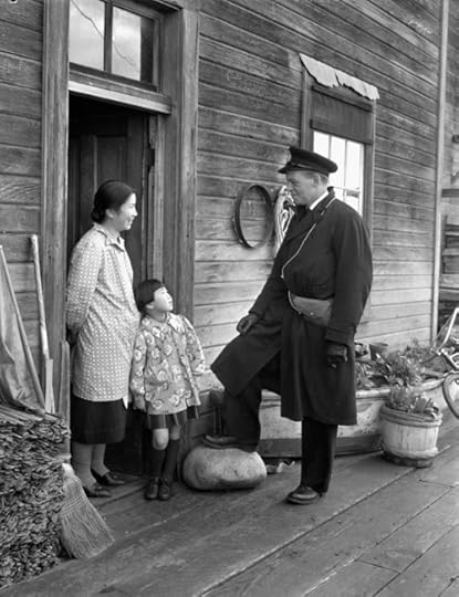 Unidentified R.C.N.V.R. officer talking with Japanese-Canadian family during internment of fishing boat.