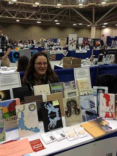 Ariel womanning the Brick Books table. Note the books by Winnipeg authors.