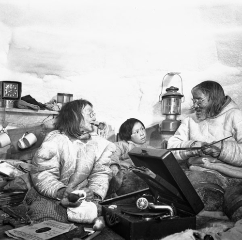 Pork working on a snow knife, while his wife Hattie makes caribou moccasins and their grandson Ikkat listens to music, Baker Lake, N.W.T., [Baker Lake (Qamanittuaq), Nunavut], March 1946. George Hunter / National Film Board of Canada. Photothèque / Library and Archives Canada / PA-183439