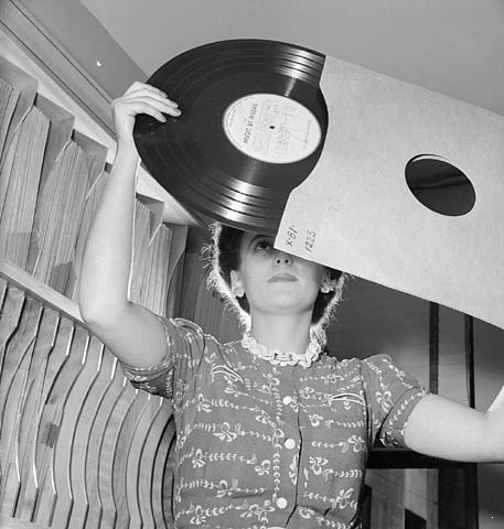 Female worker Madeleine Brown removes a vinyl record titled "Music by Muzak" from its sleeve to be played as piped music in a munitions factory. National Film Board of Canada. Photothèque / Library and Archives Canada
