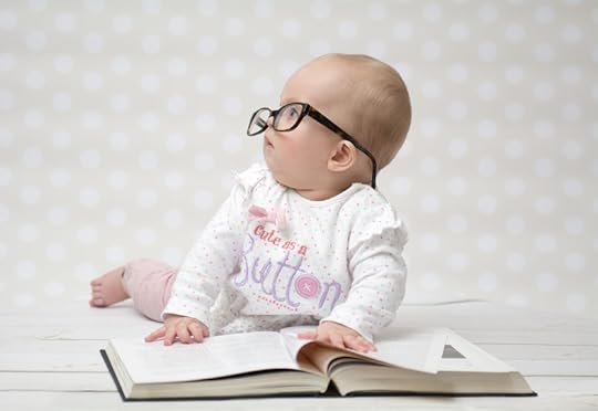 Funny portrait of a cute baby girl in glasses lying over a big book