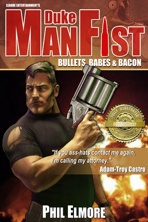 The first twenty-two episodes of my action parody, Duke Manfist, have been collected into a single ebook! On January 5th, 2012, Duke Manfist: Bullets, Babes, and Bacon will be available for purchase from Amazon.com and BN.com. An enhanced version with some great artwork from Johnny Atomic will be available from The League and Apple's iBookstore.