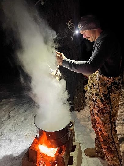 With low amounts of propane on hand, I decided to start a fire and boil water the old-school way. In a large pot I added five gallons of clean water, just enough to cover the deer, wolf, three beaver, and two marten skulls that were laying in my freezer. With enough wood added to my fire, I was able to get the water to come to a rolling boil. At the two hour mark, I took them out and started the painstaking process of removing hunks of cheek meat, cartilage, and brain matter with my forceps and knife. Some bits were “fall-off-the-bone” tender, but some areas around the gums and eyes were still clinging on to their host and forced me to put them back into the boiling water for a bit longer.