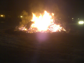 Bonfires are like television. No, not that they all seem to have Bruce Forsyth on them all the time, or that they are, basically, rubbish, but in the way that people have to watch them. Last night I saw an enormous crowd of people (OK, probably not that enormous, a few hundred or something, but you have to remember that I don't get out much, and any collection of people that isn't my immediate family looks enormous to me) all staring at a bonfire. Well, their faces were all pointing in that direction, I have to take it on trust that they were all actually staring at it and not standing with their eyes closed because that would just be a terrible waste.