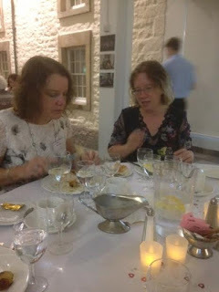 And here's Kate Allen and Kath McGurl eating dinner and gesticulating wildly to one another, in front of a waiter moving at light speed (or near enough).
