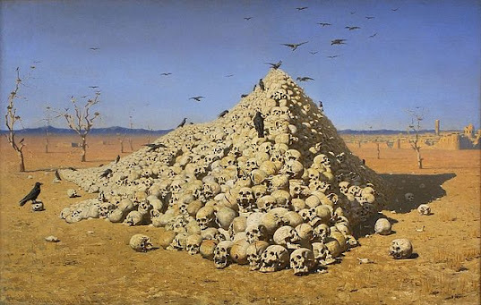 9) Άφησα για το τέλος, έναν πίνακα του Ρώσου Ζωγράφου, Basily Vereshchagin, με θέμα Η αποθέωση του Πολέμου. Φιλοτεχνήθηκε το 1871, και ίσως είναι αυτός, κατά τη γνώμη μου, που συνοψίζει όλη την τραγικότητα του πολέμου. Θάνατος και μόνο θάνατος. Ο ζωγράφος ακολουθούσε τον Ρωσικό στρατό κατά την εκστρατεία του στην περιοχή του σημερινού Τουρκμενιστάν, όπου είχε επιδοθεί σε ένα αγώνα υπόταξης όλων των ντόπιων φυλών. Αν και σήμερα χρησιμοποιείται για να δείξει τα δεινά του πολέμου, τότε είχε ως σκοπό να δείξει σε όλο τον κόσμο την δύναμη του Ρωσικού στρατού. Τελειώνοντας τον πίνακα αυτόν, τον αφιέρωσε: «σε όλους τους μεγάλους κατακτητές, στο παρελθόν, το παρόν και τον μέλλοντα» Διττή βέβαια η ανάγνωση της παραπάνω ρήσης, εμείς ας μείνουμε σε αυτό, που δείχνει και μόνο. ΥΓ Οποιοιδήποτε συνειρμοί με τον σημερινό ρωσικό στρατό, δεκτοί. Όπως και με όποιον άλλον στρατό βρίσκεται στη θέση του επιτιθέμενου, σε οποιαδήποτε στιγμή και οποιοδήποτε χρόνο.