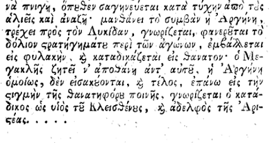 Η Αργίνη μαθαίνει για το περιστατικό με τον αγαπημένο της Λυκίδα ενώ μαθαίνεται και η απάτη του με αποτέλεσμα να φυλακιστεί και να καταδικαστεί σε θάνατο. Ο Μεγακλής αισθανόμενος την ευθύνη του, θέλει να πάρει τη θέση του, το ίδιο και η αγαπημένη του Αργίνη. Τελικά, λίγο πριν την εκτέλεση, διαπιστώνεται ότι ο Λυκίδας ήταν ο χαμένος γιός του βασιλιά Κλεισθένη και αδελφός της Αριστέας. Τον είχε διώξει μικρό, μακριά του, εξαιτίας ενός χρησμού του Μαντείου των Δελφών, που έλεγε ότι θα κινδυνέψει να σκοτωθεί από τον γιό του.