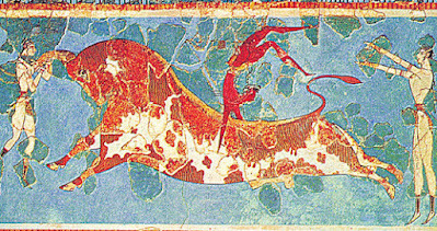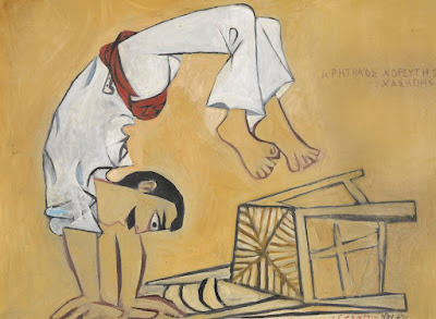 Ο παραπάνω πίνακας με μια πρώτη ματιά, δείχνει κάποιον, που κάνει κάποια περίπλοκα ακροβατικά. Αν παρατηρήσουμε τι γράφει στο φόντο, διαβάζουμε " ΚΡΗΤΙΚΟΣ ΧΟΡΕΥΤΗΣ ΧΑΣΑΠΗΣ". Άρα πρόκειται για κάποιον χασάπη, Κρητικό, ο οποίο "συλλαμβάνεται ζωγραφικά" σε κάποια χορευτική φιγούρα. Αν τώρα συγκρίνουμε τον πίνακα με την παρακάτω εικόνα - αναπαράσταση από τα Μινωίτικα Ταυροκαθάρψια, βλέπουμε αμέσως την ομοιότητα ανάμεσα στα δύο κεντρικά πρόσωπα των δύο εικόνων.