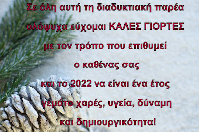 Στην διαδικτυακή μικροκοινωνία που συνυπάρχω κι εγώ ανάμεσα σε πολλούς άλλους φίλους και φίλες, ειδικά εδώ που έχουμε δημιουργήσει τη δική μας blogo-παρέα, θα ήθελα να ευχηθώ τα καλύτερα, σε όλους σας για το Νέο Έτος. Φοβάμαι τις ατομικές ευχές διότι, παρά τις φιλότιμες προσπάθειες μου, πάντα κάποιον θα ξεχάσω... αν και σε κάποιους πρόλαβα να ευχηθώ μέσα από τις αναρτήσεις τους. Οι Νέες Τεχνολογίες, παρά τα όποια αρνητικά μπορεί να τους προσάψει κανείς, έχουν διαπλατύνει τον ορίζοντα των ονείρων μας. Βρήκαμε καλούς φίλους, ανθρώπους πρόθυμους να μας ακούσουν, να μοιραστούν τις αγωνίες μας, να χαρούμε ο ένας τις δημιουργίες του άλλου. Με πολλούς συμπορευόμαστε εδώ και πολλά χρόνια, άλλους με χαρά τους γνώρισα πρόσφατα και δυστυχώς άλλους τους έχασα, κάπου στη διαδρομή κουράστηκαν, δεν τους αδικώ, το πληκτρολόγιο προϋποθέτει τη δική του μοναξιά η οποία κάποτε γίνεται αβάστακτη.