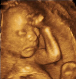 A 3D ultrasound at 21 weeks. The baby sucks it thumb, yawns and mother can feel its movements.So back to our initial question of when a baby becomes a human being… The pro-choice position is that the 21 week old baby in the photo to the left is not a human, and thus can be terminated. This is different from killing a one-week old infant out of the womb because that infant is a human with rights. Keeping the humble position that we don’t know when a baby gets a soul / becomes human, assuming both “at conception” and “at viability” are arbitrary guesses, look at this photo and ask if this yawning, thumb-sucking, kicking bundle of intricate beauty and complex organs is a human baby or a non-human something else.